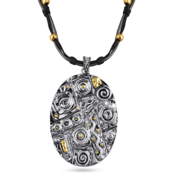 Изготовлено из ювелирного сплава на основе латуни с гальваническим покрытием золотом и родием. Длина колье из кожаных шнурков черного и темно-серого цвета 50см. Замок-карабин с удлинителем 5см.