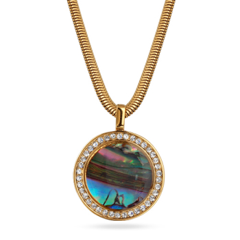 Изготовлено из ювелирного сплава на основе латуни с гальваническим покрытием золотом. Изделие украшает гелиотис. Длина цепочки 45см. Замок-карабин с удлинителем 5см. Диаметр кулона 2см.
