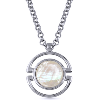 Изготовлено из ювелирного сплава на основе латуни с гальваническим покрытием родием. Изделие украшает белый перламутр. Длина цепочки 85см. Замок-карабин с удлинителем 5см. Диаметр кулона 5см.