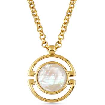 Изготовлено из ювелирного сплава на основе латуни с гальваническим покрытием золотом. Изделие украшает белый перламутр. Длина цепочки 85см. Замок-карабин с удлинителем 5см. Диаметр кулона 5см.