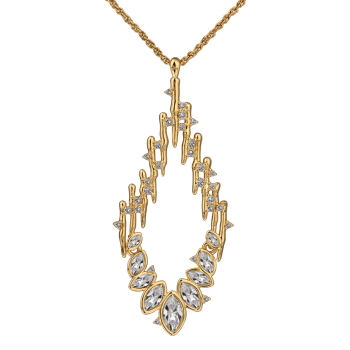 Изготовлено из ювелирного сплава на основе латуни с гальваническим покрытием золотом. Изделие украшают кристаллы SW белого цвета. На цепочке установлен бегунок регулировки длины. Максимальная длина 90см. Кулон 7х3см.