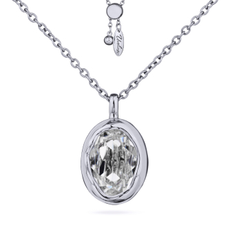 Изготовлено из ювелирного сплава на основе латуни с гальваническим покрытием родием. Изделие украшают кристаллы SW белого цвета 18х13мм. На цепочке установлен бегунок регулировки длины.