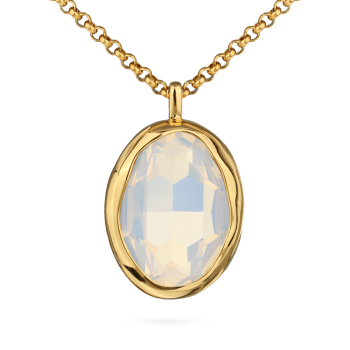Изготовлено из ювелирного сплава на основе латуни с гальваническим покрытием золотом. Изделие украшают кристаллы SW цвета белый опал. Размер кулона 34х26мм. Длина цепочки 90см. Удлинитель 5см.