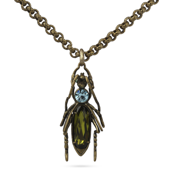 Изготовлено из ювелирного сплава на основе латуни с гальваническим покрытием бронзой. Изделие украшают кристаллы SW зеленого и голубого цвета. Размер украшения 4х1.5см. Длина цепочки 50см.