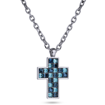 Изготовлено из ювелирного сплава на основе латуни с гальваническим покрытием родием. Изделие украшают кристаллы SW цвета джинс и аквамарин. Длина цепочки 50см. Размер кулона 3.2х2.2см.