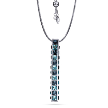 Изготовлено из ювелирного сплава на основе латуни с гальваническим покрытием родием. Изделие украшают кристаллы SW цвета джинс и аквамарин. На цепочке установлен регулятор длины. Максимальная длина цепочки 80см. Размер кулона 4.5х0.3см.