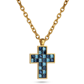 Изготовлено из ювелирного сплава на основе латуни с гальваническим покрытием золотом. Изделие украшают кристаллы SW цвета джинс и аквамарин. Длина цепочки 50см. Размер кулона 3.2х2.2см.