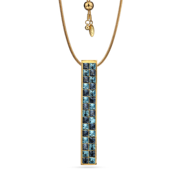 Изготовлено из ювелирного сплава на основе латуни с гальваническим покрытием золотом. Изделие украшают кристаллы SW цвета джинс и аквамарин. На цепочке установлен регулятор длины. Максимальная длина цепочки 80см. Размер кулона 5.5х0.8см.