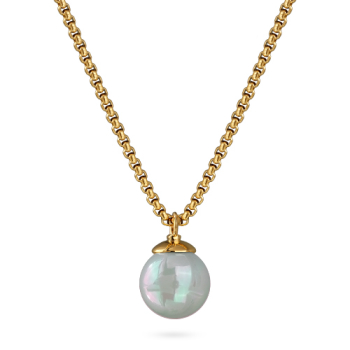 Изготовлено из ювелирного сплава на основе латуни с гальваническим покрытием золотом. Изделие украшает жемчуг Майорка диаметром 14мм голубого цвета. Длина 50см. Замок-карабин с удлинителем 7см.