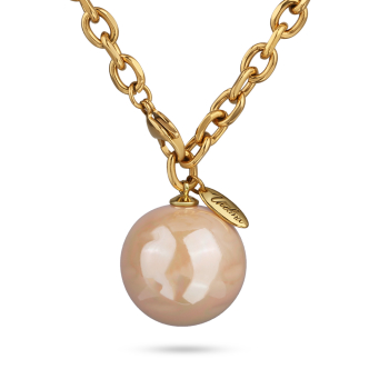 Изготовлено из ювелирного сплава на основе латуни с гальваническим покрытием золотом. Изделие украшает жемчуг Майорка белого цвета диаметром 25мм. Длина цепочки 95см.