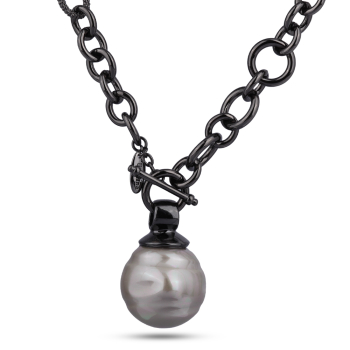 Изготовлено из ювелирного сплава на основе латуни с гальваническим покрытием черным родием. Изделие украшает барочный жемчуг Майорка цвета шампань диаметром 30мм. Длина цепочки 80см. Замок-тогл.