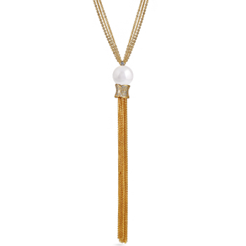 Изготовлено из ювелирного сплава на основе латуни с гальваническим покрытием золотом. Изделие выполнено из жемчуга Майорка диаметром 16мм и фианитов белого цвета. Длина 85-90см.