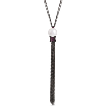 Изготовлено из ювелирного сплава на основе латуни с гальваническим покрытием черным родием. Изделие выполнено из белого жемчуга Майорка диаметром 16мм и фианитов цвета фуксия. Длина 85-90см.