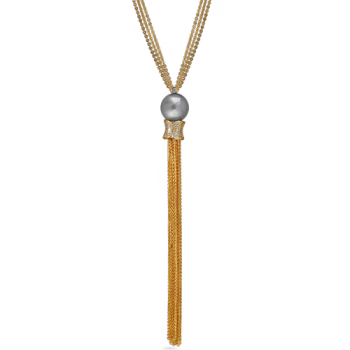 Изготовлено из ювелирного сплава на основе латуни с гальваническим покрытием золотом. Изделие выполнено из светло-серого жемчуга Майорка диаметром 16мм и фианитов белого цвета. Длина 85-90см.