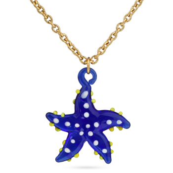 Изготовлено из ювелирного сплава на основе латуни с гальваническим покрытием золотом. Изделие украшает муранское стекло синего цвета. Размер украшения 4х3.5см. Длина цепи 90см.
