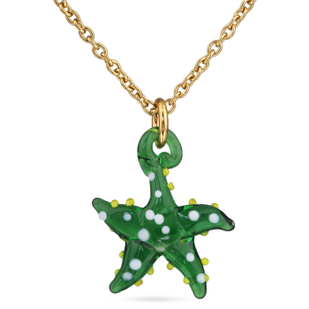 Изготовлено из ювелирного сплава на основе латуни с гальваническим покрытием золотом. Изделие украшает муранское стекло зеленого цвета. Размер украшения 4х3.5см. Длина цепи 90см.
