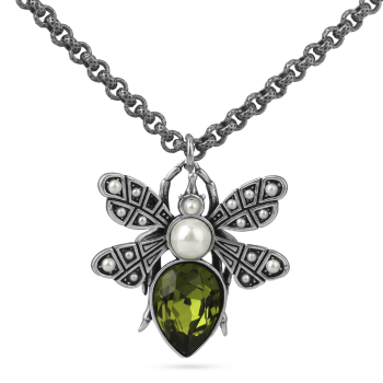 Изготовлено из ювелирного сплава на основе латуни с гальваническим покрытием античным серебром. Изделие украшают кристаллы SW зеленого цвета и белый майорский жемчуг диаметром 6мм. Длина цепочки 50см. Размер кулона 3.5х3см.