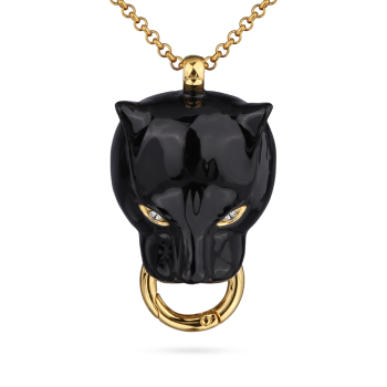 Изготовлено из ювелирного сплава на основе латуни с гальваническим покрытием золотом. Изделие покрыто эмалью черного цвета и украшено белыми кристаллами SW. Размер украшения 5х3, 5см. Длина цепи 80см. Замок-карабин с удлинителем 5см.