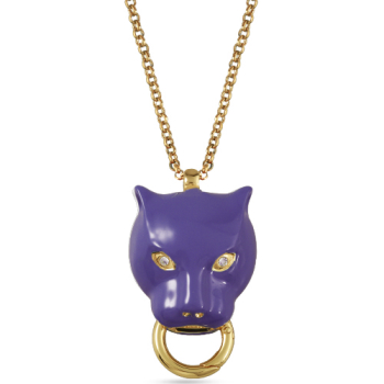 Изготовлено из ювелирного сплава на основе латуни с гальваническим покрытием золотом. Изделие покрыто эмалью фиолетового цвета и украшено белыми кристаллами SW. Длина цепочки 80см. Замок-карабин с удлинителем 5см. Размер украшения 5х3, 5см.