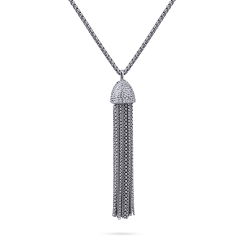 Изготовлено из ювелирного сплава на основе латуни с гальваническим покрытием родием. Длина 84см. Замок-карабин с удлинителем 6см. Длина кулона 10см.