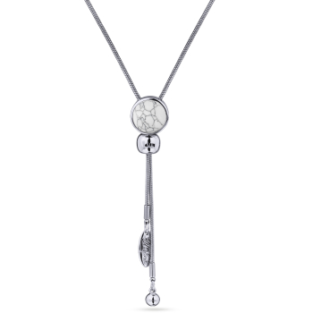 Изготовлено из ювелирного сплава на основе латуни с гальваническим покрытием родием. Изделие украшает белая бирюза. Длина колье 90см. На цепочке установлен бегунок регулировки длины.