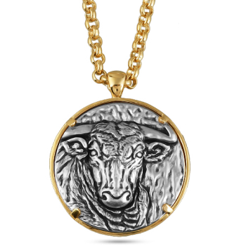 Изготовлено из ювелирного сплава на основе латуни с гальваническим покрытием золотом и античным золотом. Диаметр кулона 4см, длина 95см.