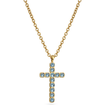 Изготовлено из ювелирного сплава на основе латуни с гальваническим покрытием золотом. Изделие украшают кристаллы SW цвета аквамарин диаметром 4мм. Длина цепочки 50 — 55см. Размер кулона 5х2, 5см.