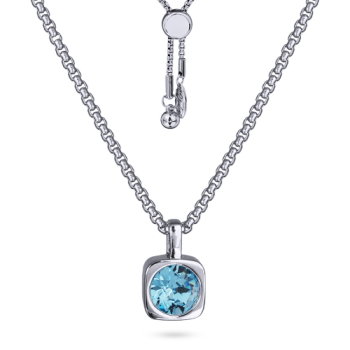 Изготовлено из ювелирного сплава на основе латуни с гальваническим покрытием родием. Изделие украшают кристаллы SW аквамаринового цвета диаметром 8мм. Размер кулона 1.5х1см. На цепочке установлен бегунок регулировки длины. Максимальная длина 70см.