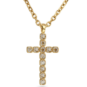 Изготовлено из ювелирного сплава на основе латуни с гальваническим покрытием золотом. Изделие украшают кристаллы SW цвета шампань диаметром 6мм. Длина цепочки 50-55см. Размер кулона 6.8х4см.