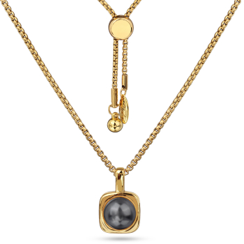 Изготовлено из ювелирного сплава на основе латуни с гальваническим покрытием золотом. Изделие украшает Майорка темно-серого цвета диаметром 8мм. Размер кулона 1.5х1см. Длина 70см. На цепочке установлен бегунок регулировки длины.