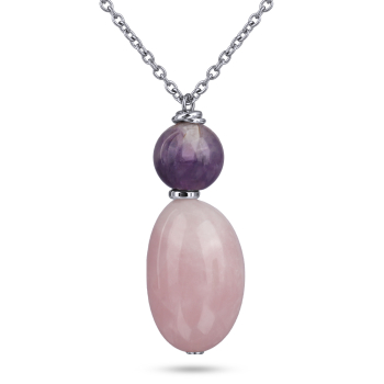 Изготовлено из ювелирного сплава на основе латуни с гальваническим покрытием родием. Изделие украшают аметист диаметром 18мм и кварц размером 38х26мм. Длина цепочки 90см.