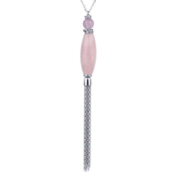 Изготовлено из ювелирного сплава на основе латуни с гальваническим покрытием родием. Изделие украшают фиолетовый морганит диаметром 12мм и кварц. Длина цепочки 90см. Замок-карабин с удлинителем 5см. Длина кулона 17см.
