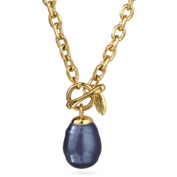 Изготовлено из ювелирного сплава на основе латуни с гальваническим покрытием золотом. Изделие украшает барочный жемчуг Майорка черничного цвета диаметром 14мм. Длина цепочки якорного плетения 50см.