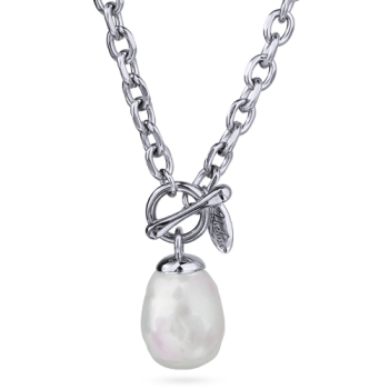 Изготовлено из ювелирного сплава на основе латуни с гальваническим покрытием родием. Изделие украшает барочный жемчуг Майорка белого цвета диаметром 18мм. Длина цепочки якорного плетения 50см.
