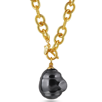 Изготовлено из ювелирного сплава на основе латуни с гальваническим покрытием золотом. Изделие украшает барочный жемчуг Майорка темно-серого цвета диаметром 18мм. Длина цепочки 80см. Замок-якорь.