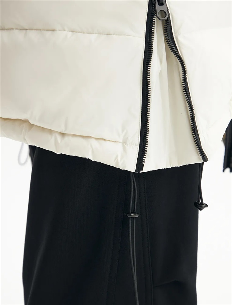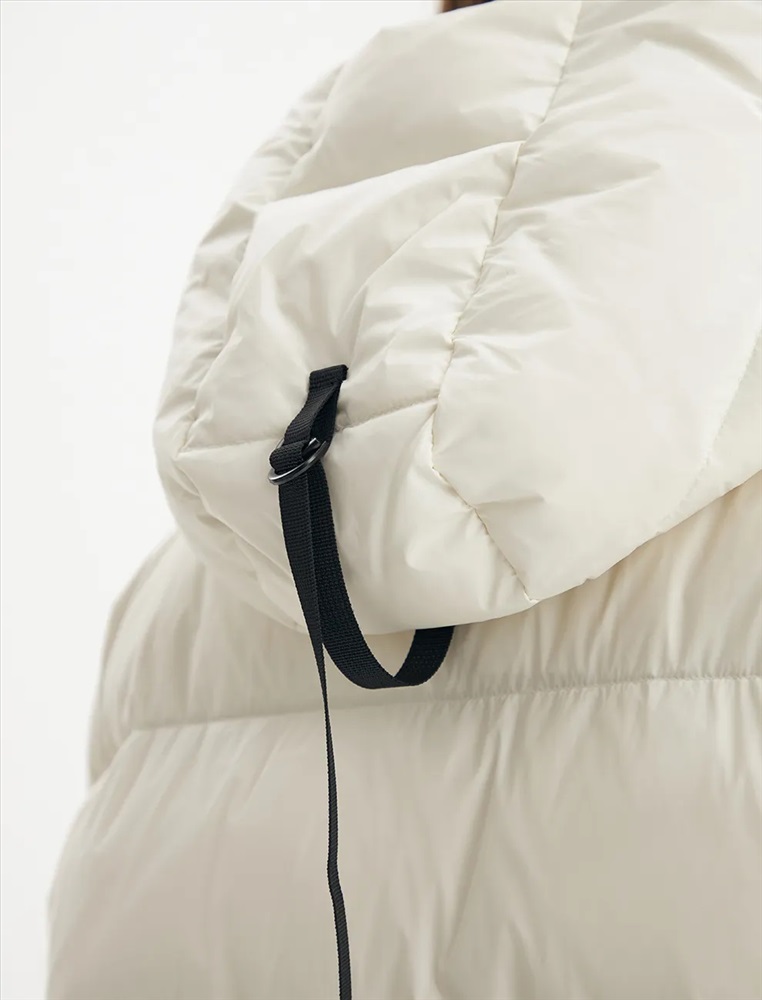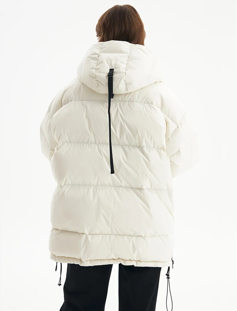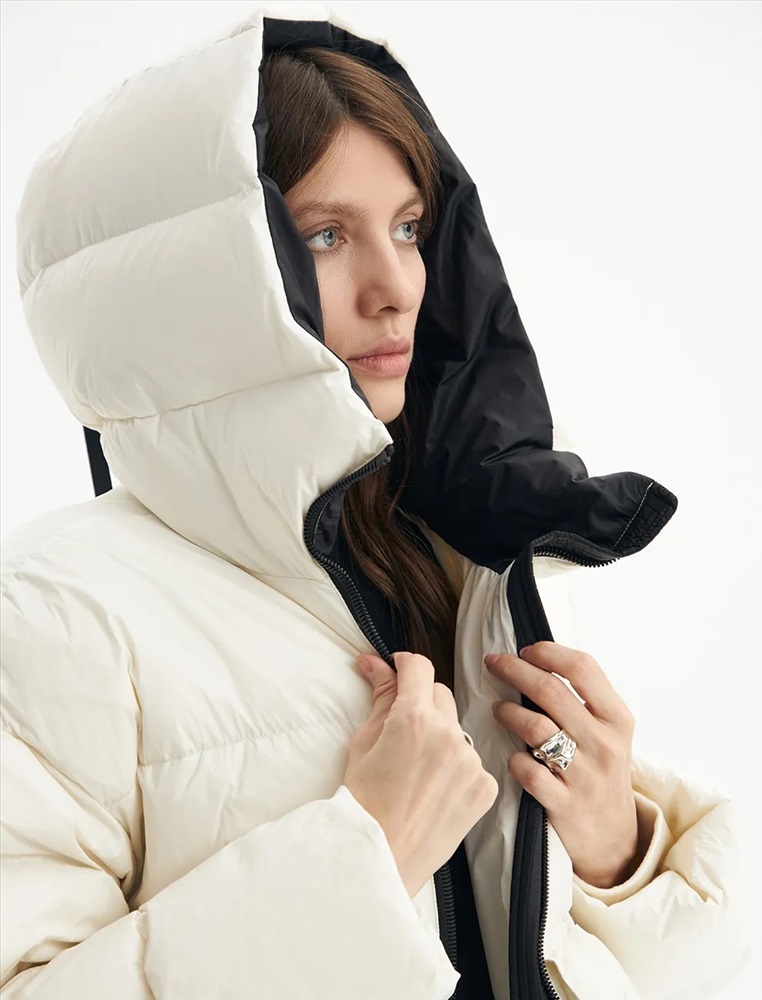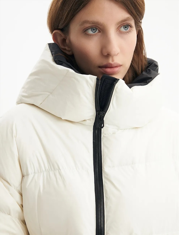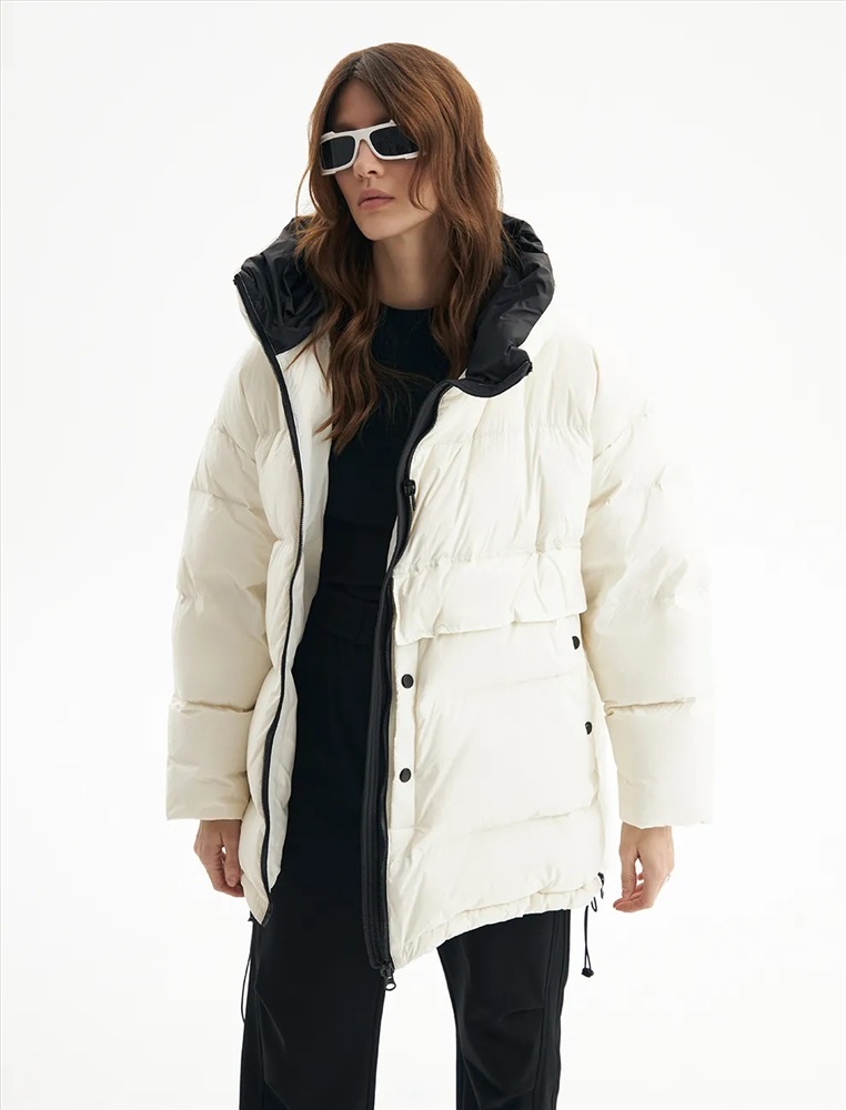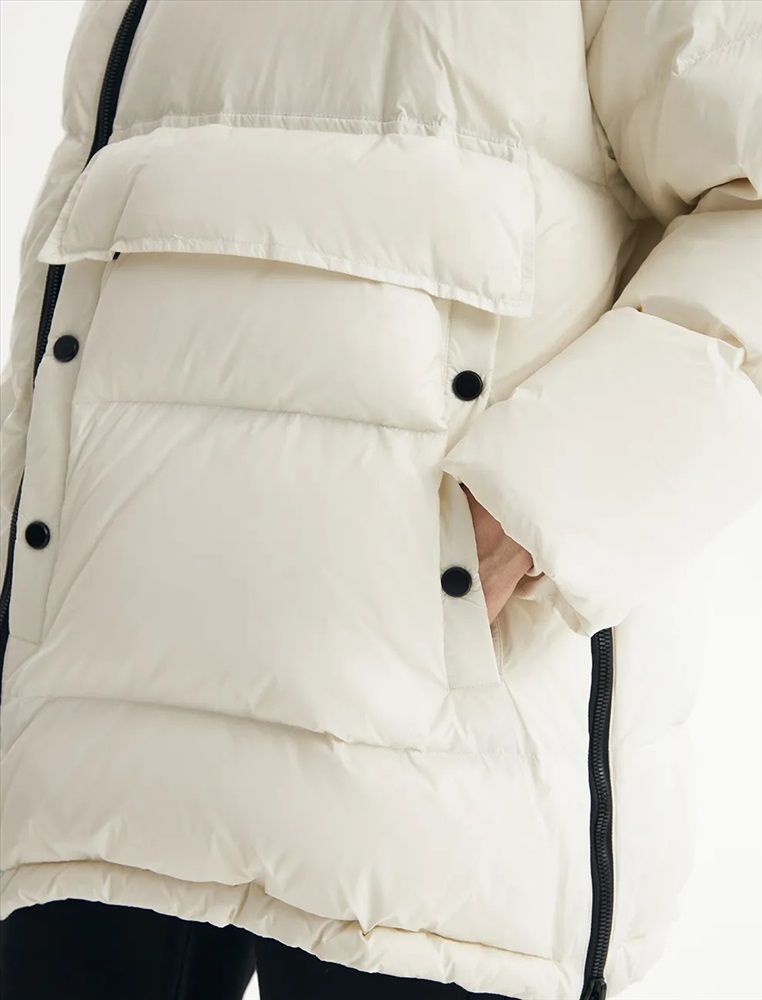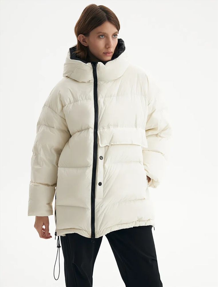 Пуховик средней длины прямого силуэта с опущенной линией плеча. Акцентом изделия является накладной карман с клапаном и декоративными кнопками. По переду проходит смещенная реверсивная молния. Воротник-стойка с капюшоном и низ изделия регулируются резинкой с ограничителем. Внутренние трикотажные манжеты обеспечивают защиту от ветра. В боковых швах молнии, регулирующие объем в области низа.