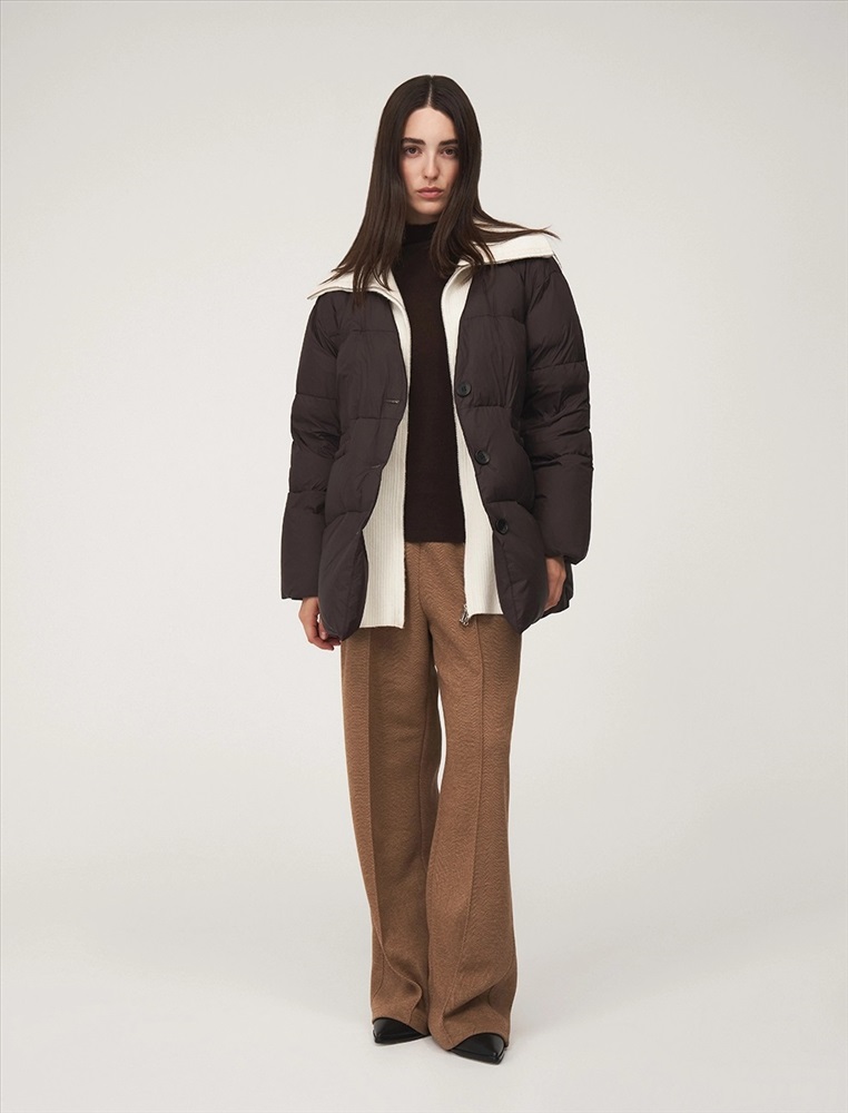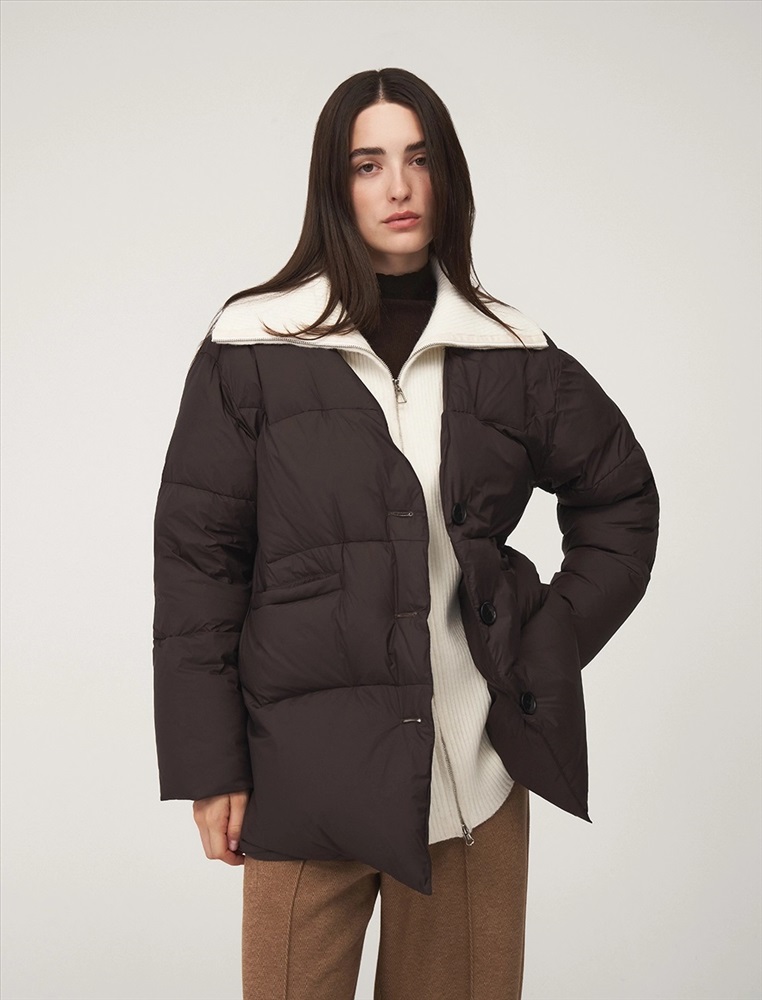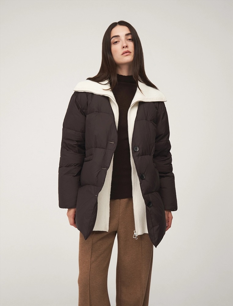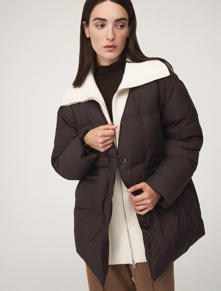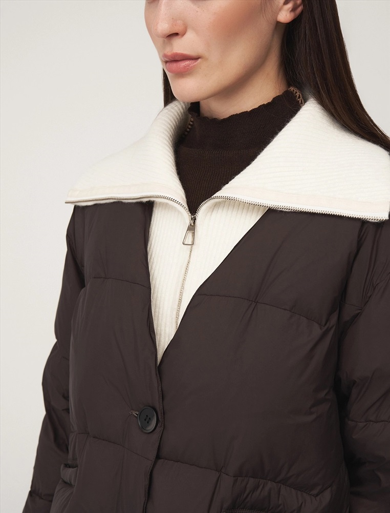 Пуховик коконообразного силуэта с фигурной стежкой, длина ниже бедра. По передней части изделия застежка на пуговицы и карманы с листочкой. Встроенная трикотажная вставка с высоким воротником застегивается на молнию. В составе утеплителя утиный пух (90%) и утиное перо. Ткань верха представлена в шоколадном оттенке, а трикотажная вставка снизу в контрастном молочном цвете.