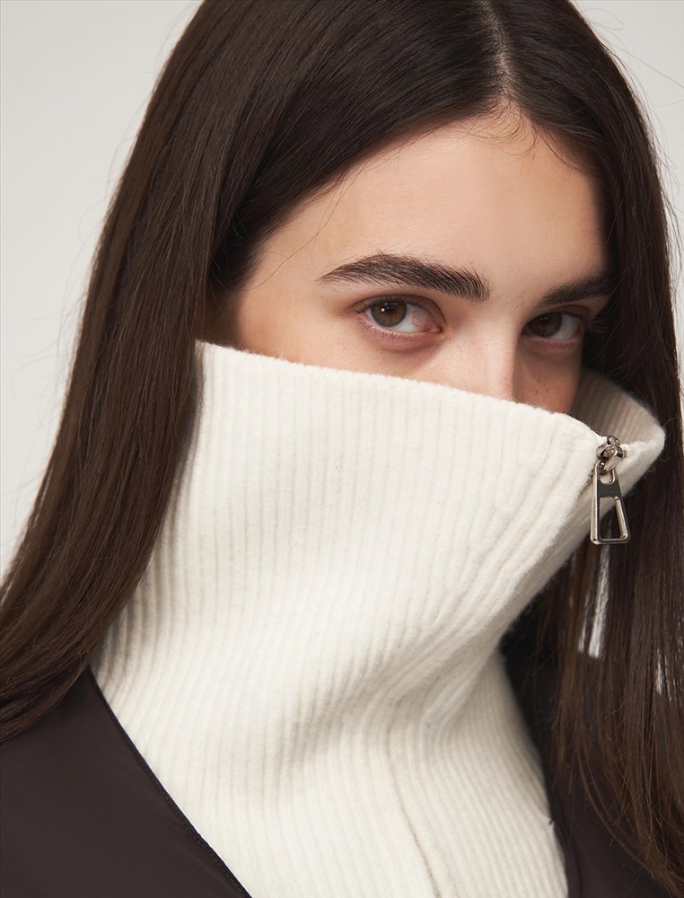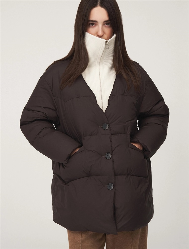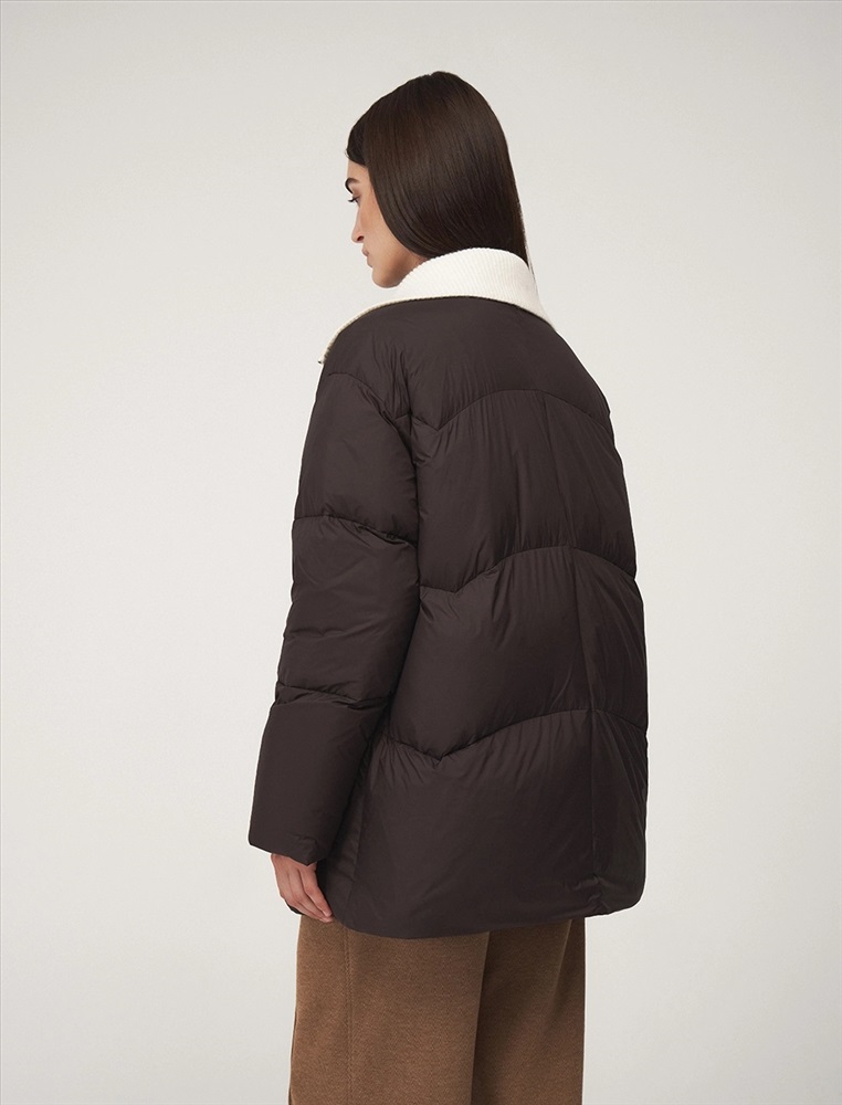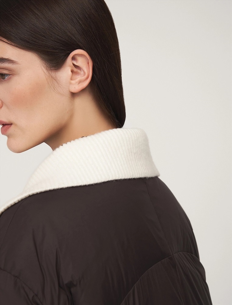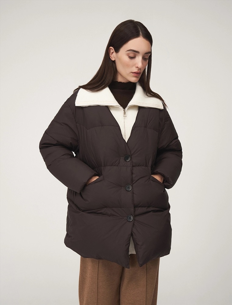 Пуховик коконообразного силуэта с фигурной стежкой, длина ниже бедра. По передней части изделия застежка на пуговицы и карманы с листочкой. Встроенная трикотажная вставка с высоким воротником застегивается на молнию. В составе утеплителя утиный пух (90%) и утиное перо. Ткань верха представлена в шоколадном оттенке, а трикотажная вставка снизу в контрастном молочном цвете.