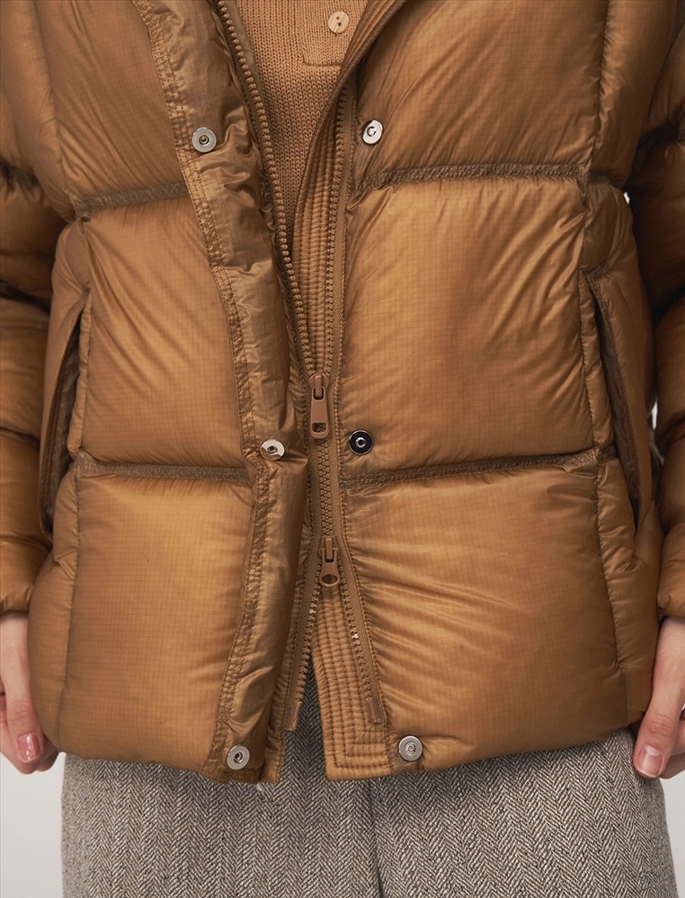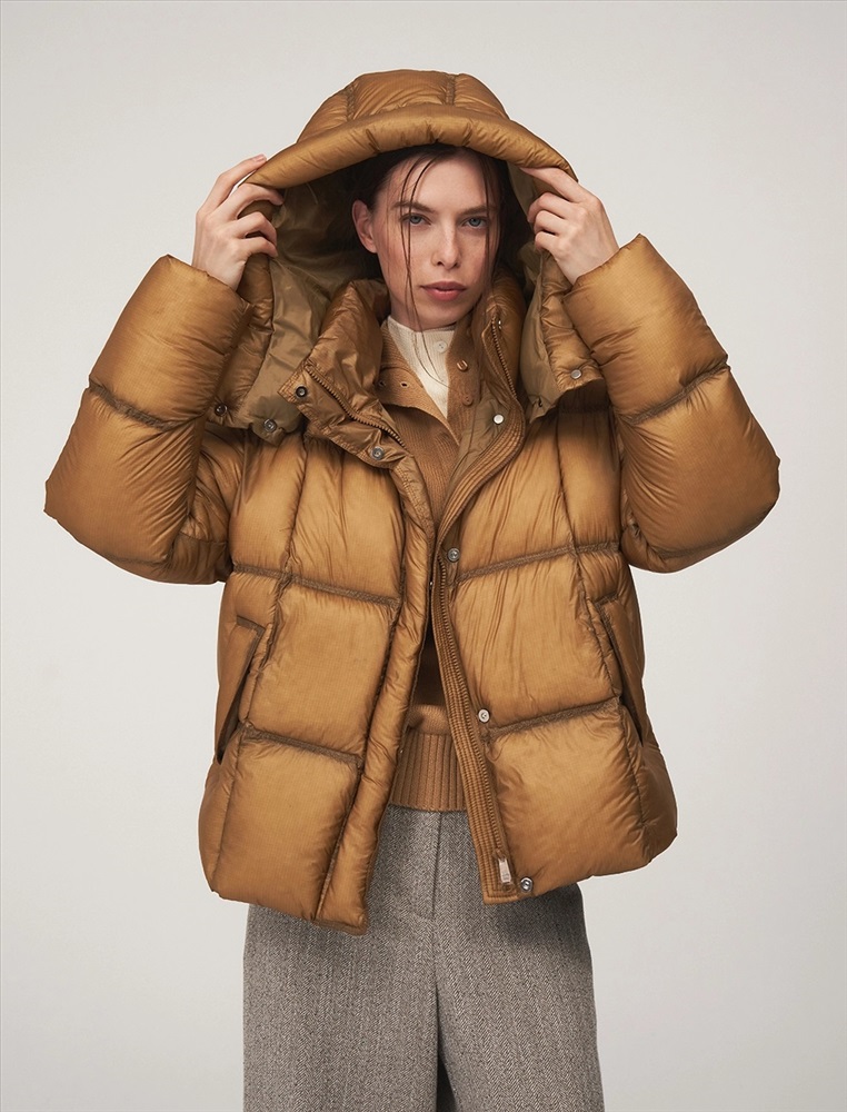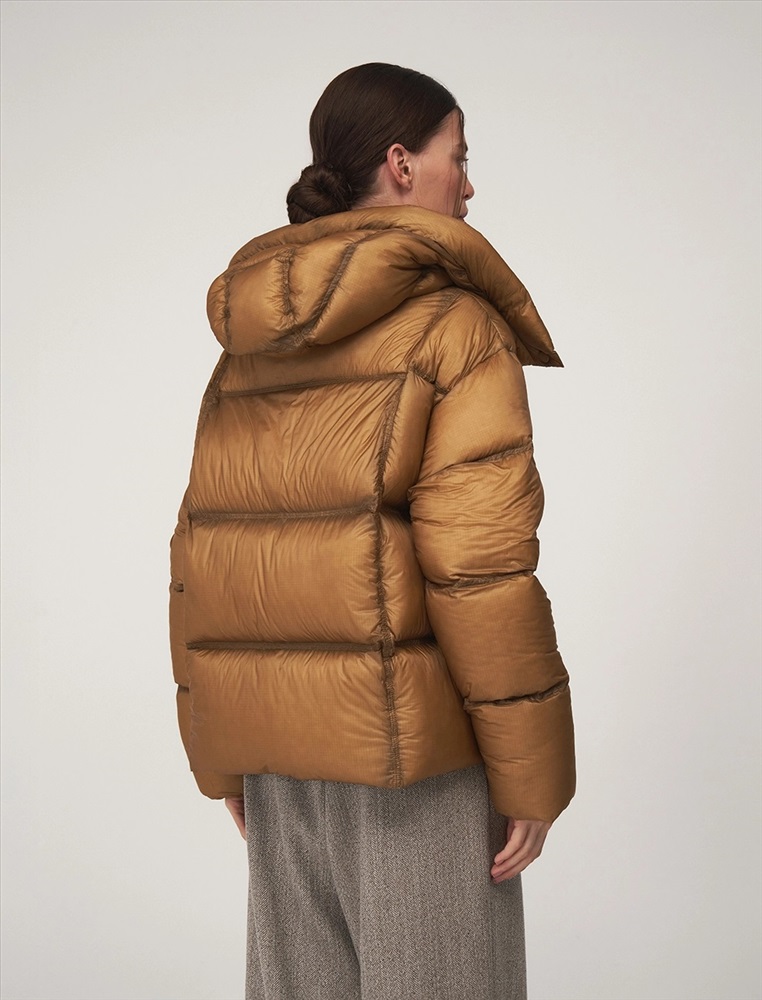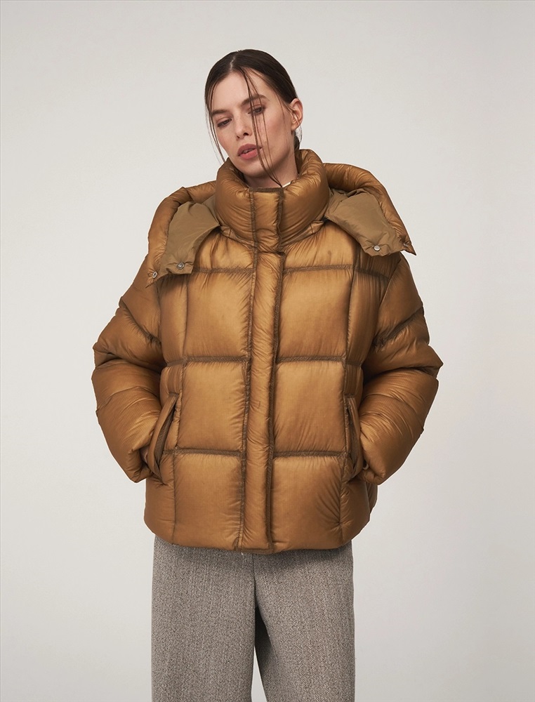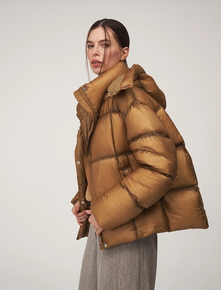 Пуховик О-образного силуэта, длиной до уровня бедра и спущенной линией плеча. Высокий воротник и капюшон защищают от ветра. По передней части планка с застежкой на кнопки и молния с двумя пуллерами. По бокам врезные карманы с листочкой. По низу затяжники с фиксаторами. В составе утеплителя утиный пух (90%) и утиное перо. Представлен в горчичном оттенке.