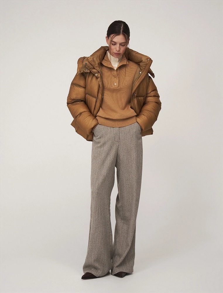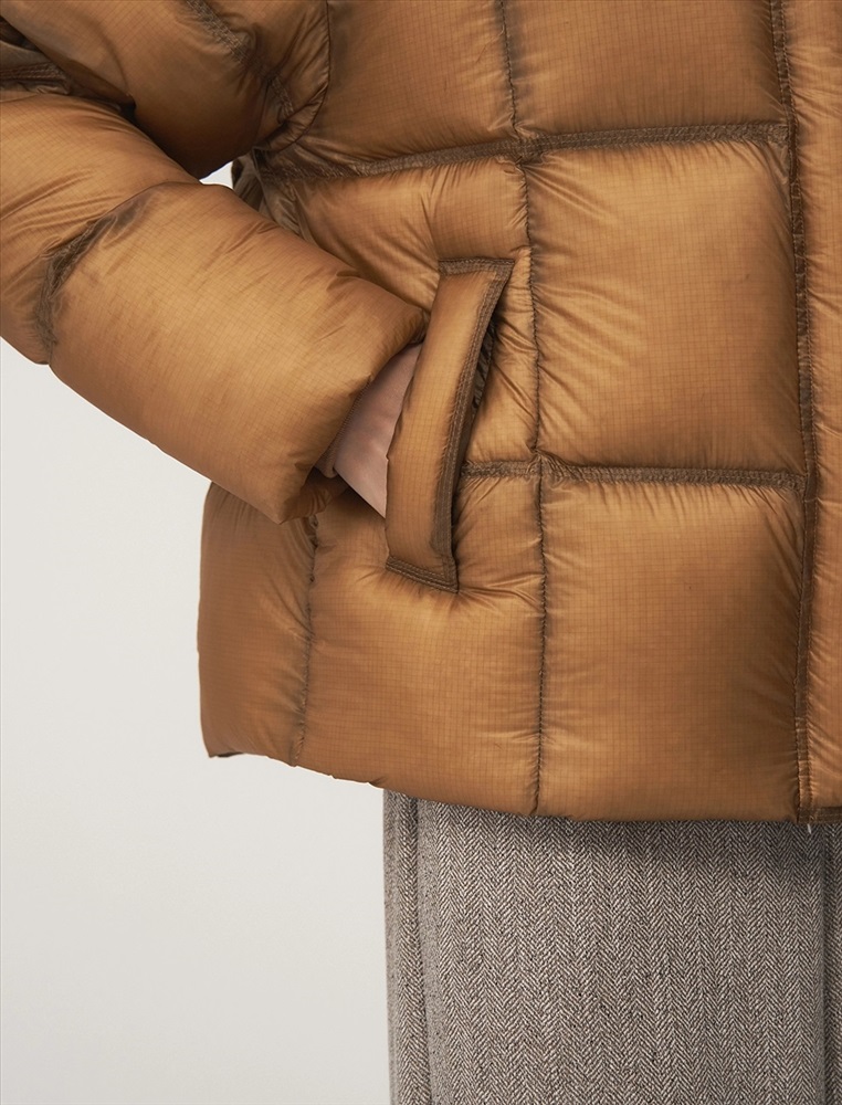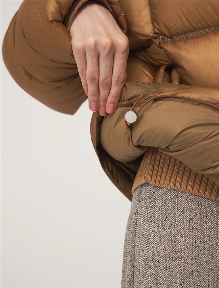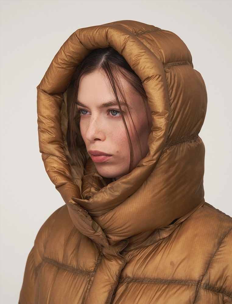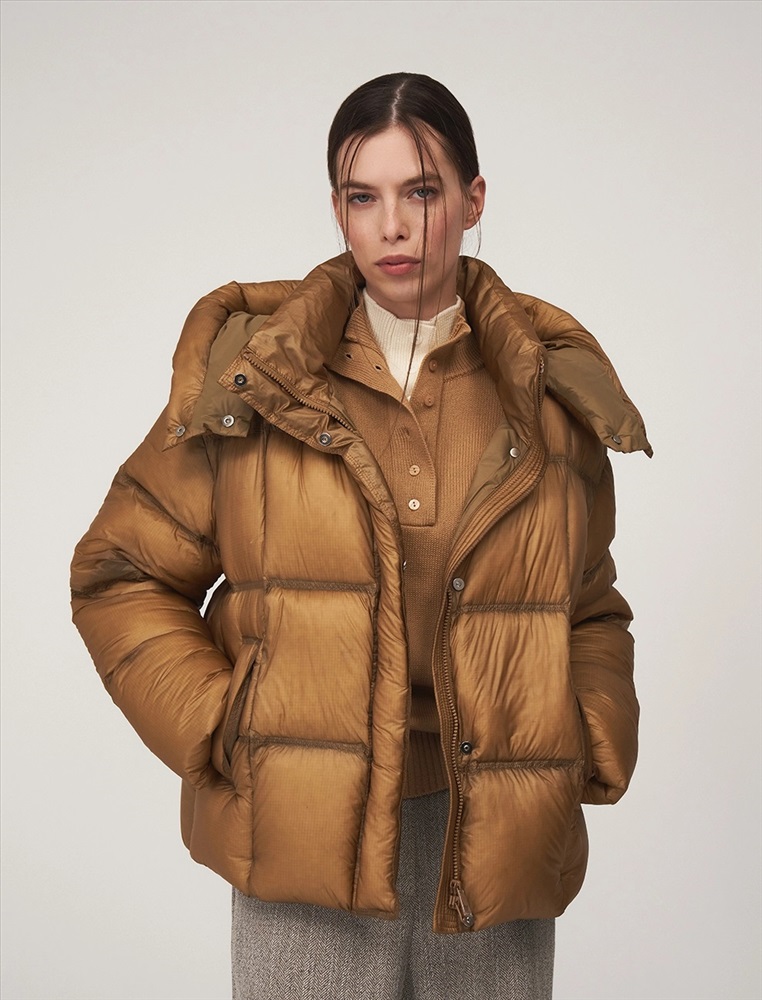 Пуховик О-образного силуэта, длиной до уровня бедра и спущенной линией плеча. Высокий воротник и капюшон защищают от ветра. По передней части планка с застежкой на кнопки и молния с двумя пуллерами. По бокам врезные карманы с листочкой. По низу затяжники с фиксаторами. В составе утеплителя утиный пух (90%) и утиное перо. Представлен в горчичном оттенке.