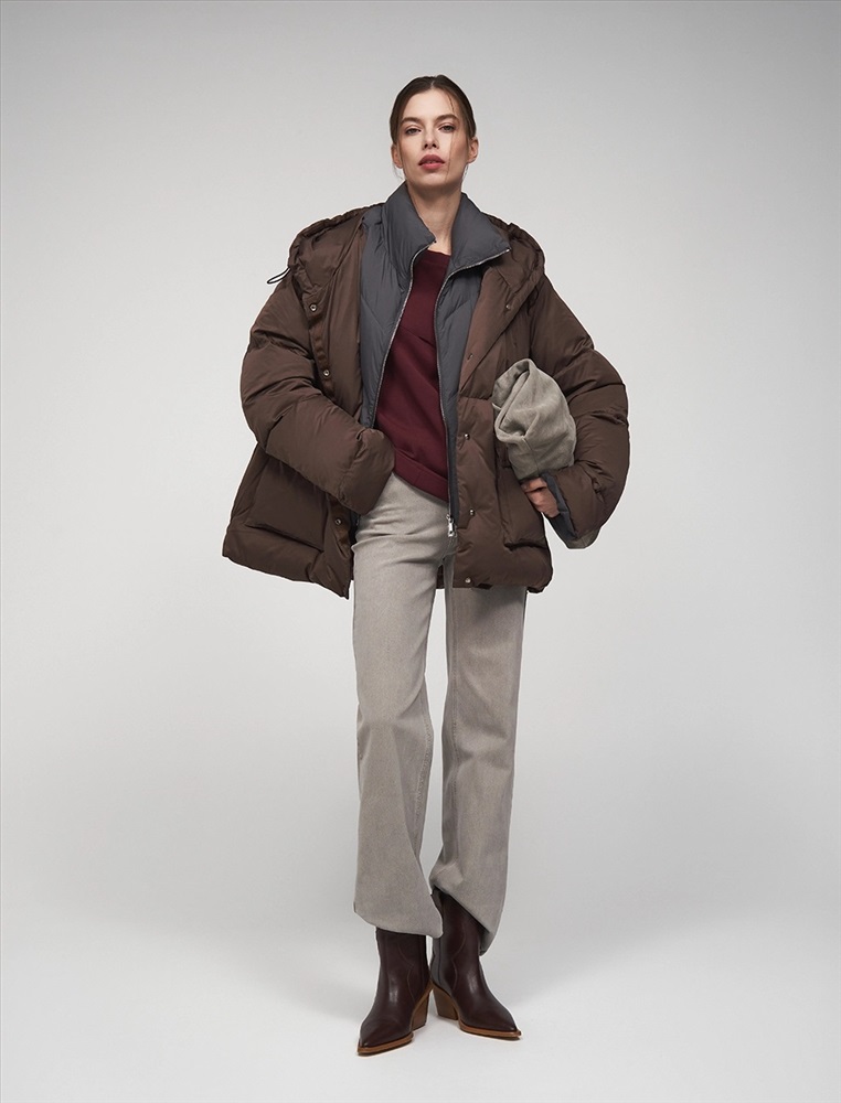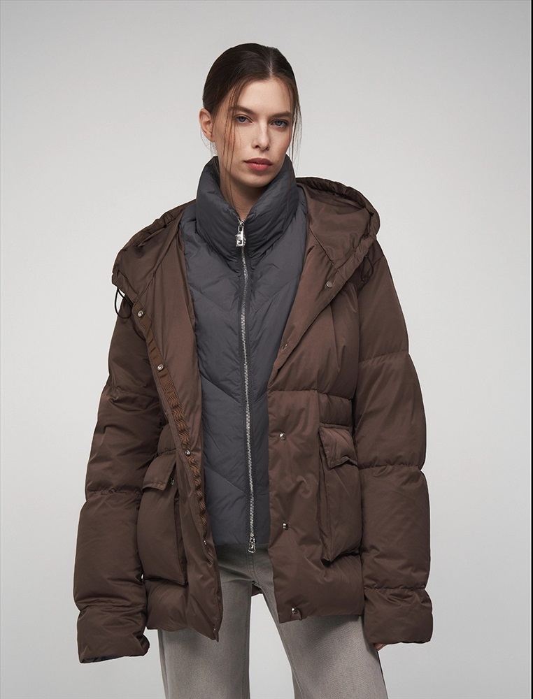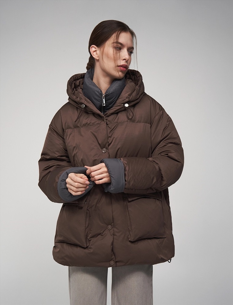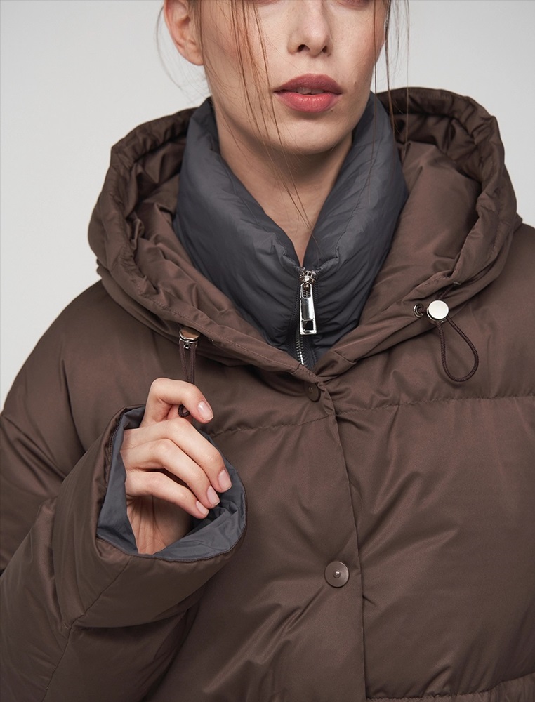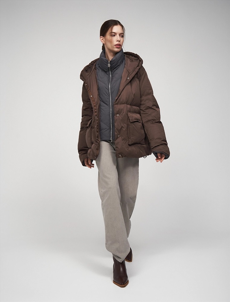 Видео: https-//hassfashion.ru/upload/iblock/826/l250kw4es7rnndu0mob1hwj01w4yz79a.mp4 осень-зима А: 100% Полиэстер В: 90% Утиный пух, 10% Утиное перо С: 100% Полиэстер Пуховик коконообразного силуэта с горизонтальной стежкой. Линия рукава спущена. Длина ниже бедра. По передней части изделия застежка на молнию и на магнитные кнопки, два накладных кармана с клапанами. Большой капюшон хорошо защищает от ветра и затягивается с помощью эластичных шнурков со стопперами. В составе утеплителя суперлегкий утиный пух (90%) и утиное перо, которые обеспечивают тепло и комфорт. Имитация жилетки снизу придает эффект многослойности. Представлен в коричневом оттенке с синими подворотами на рукавах и вторым нижнем слоем в таком же цвете.