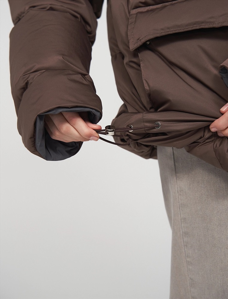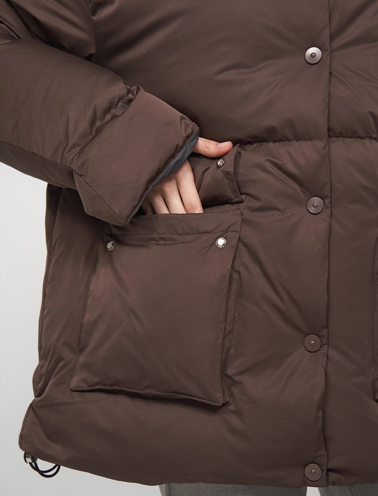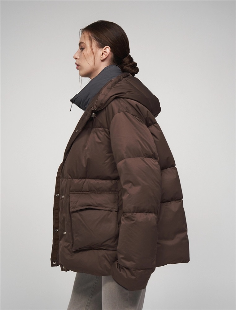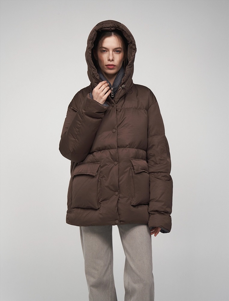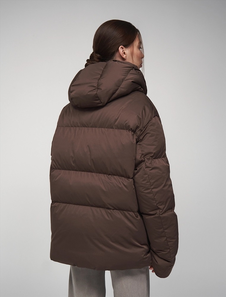 Видео: https-//hassfashion.ru/upload/iblock/826/l250kw4es7rnndu0mob1hwj01w4yz79a.mp4 осень-зима А: 100% Полиэстер В: 90% Утиный пух, 10% Утиное перо С: 100% Полиэстер Пуховик коконообразного силуэта с горизонтальной стежкой. Линия рукава спущена. Длина ниже бедра. По передней части изделия застежка на молнию и на магнитные кнопки, два накладных кармана с клапанами. Большой капюшон хорошо защищает от ветра и затягивается с помощью эластичных шнурков со стопперами. В составе утеплителя суперлегкий утиный пух (90%) и утиное перо, которые обеспечивают тепло и комфорт. Имитация жилетки снизу придает эффект многослойности. Представлен в коричневом оттенке с синими подворотами на рукавах и вторым нижнем слоем в таком же цвете.