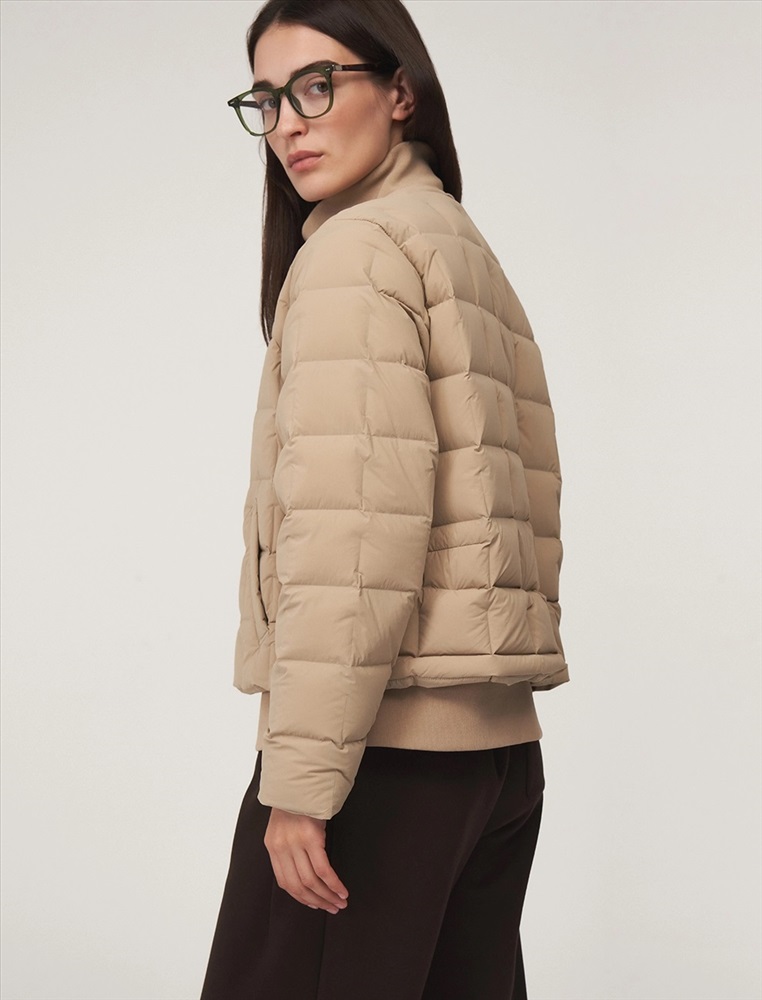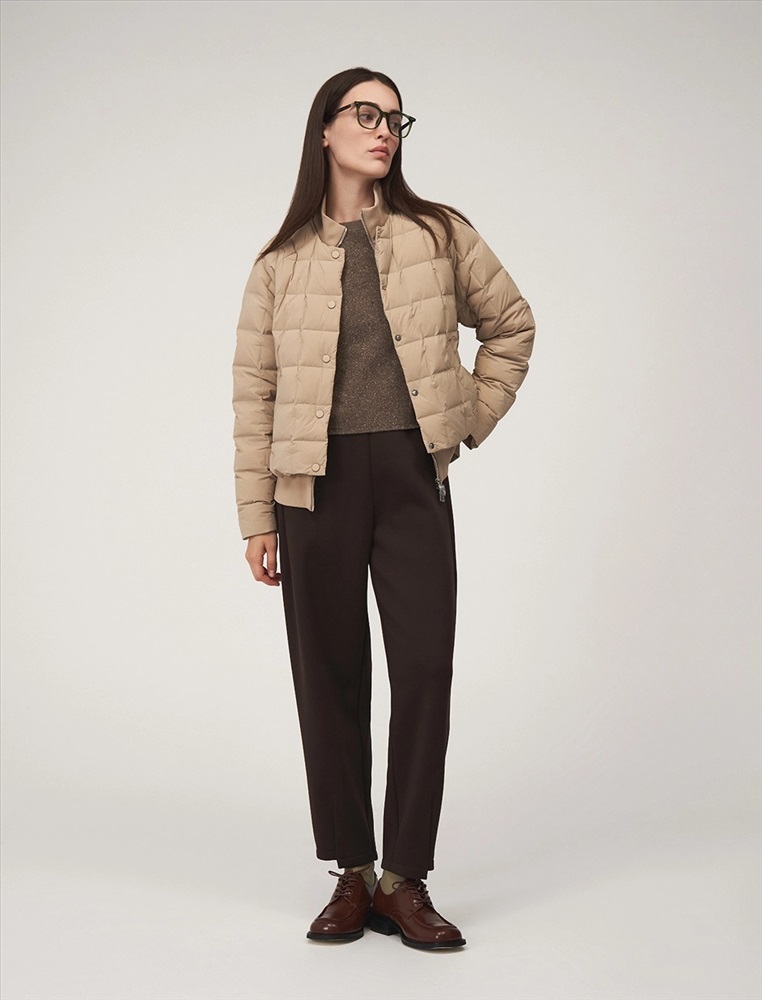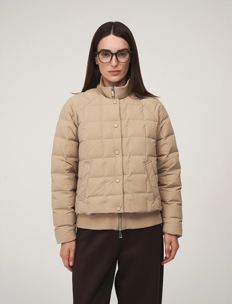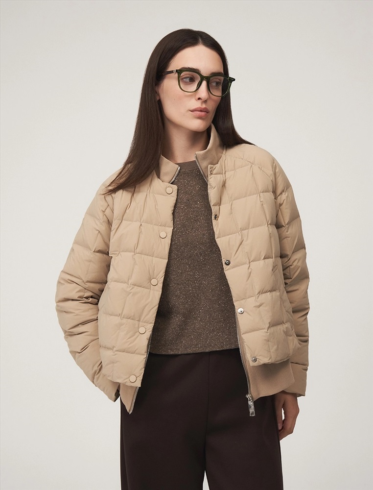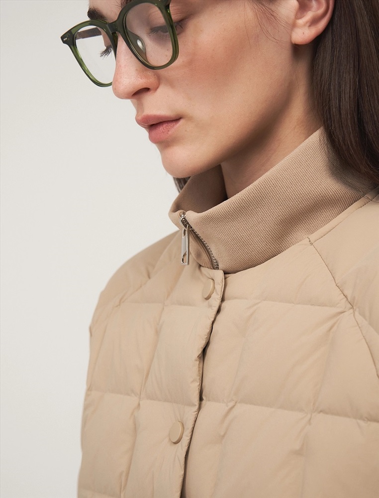 Стеганая куртка полуприелающего силуэта О-образной формы, с рукавами по типу реглан. По передней части застежка на кнопки и боковые врезные карманы с листочкой. Трикотажная подкладка застегивается на молнию. Стеганая ткань с наполнителем из утиного пуха (90%) и пера обеспечивает тепло и защиту от ветра. Представлена в бежевом и черном цвете.