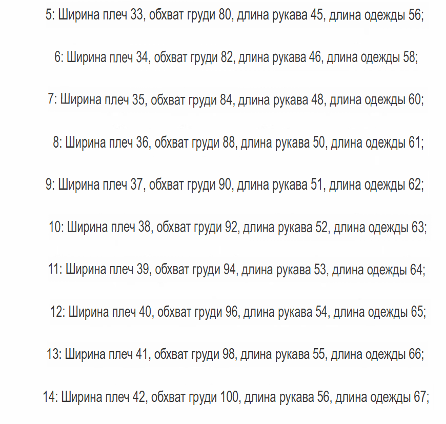 Размер: 110 - 5, 116 - 6, 122 - 7, 128 - 8, 134 - 9, 140 - 10, 146 - 11, 152 - 12, 158 - 13, 164 - 14