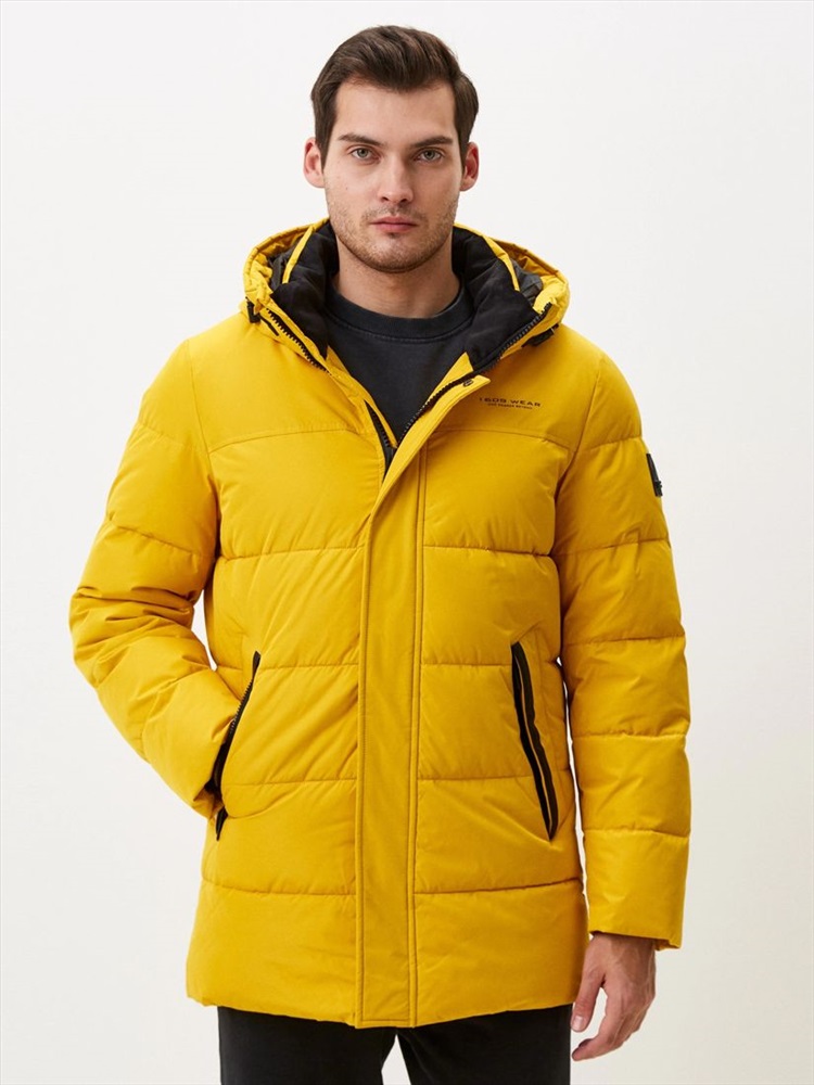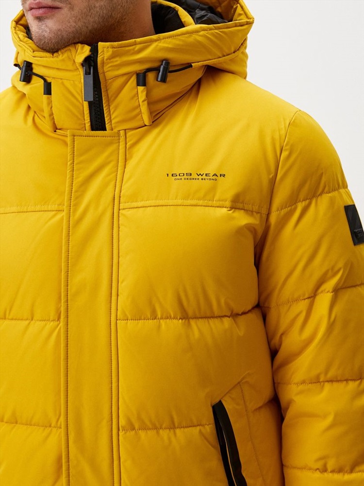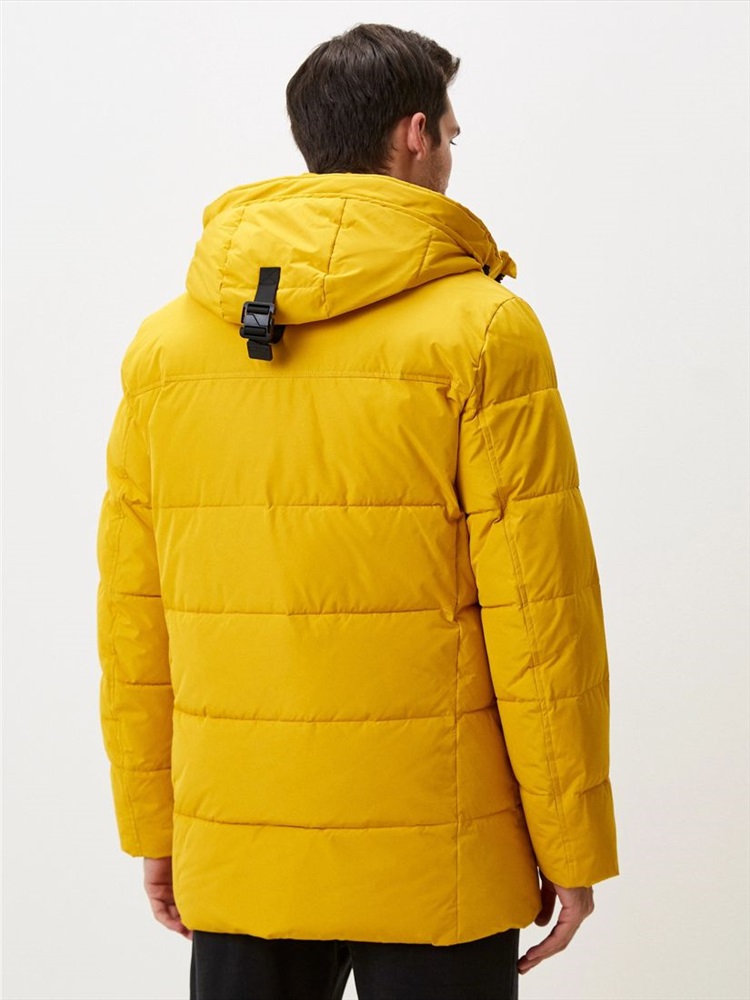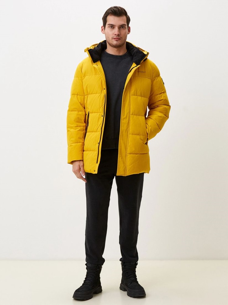 Длина: 88 см Этот пуховик желтого цвета с черной отделкой  не только обеспечит комфорт в непогоду, но и добавит красок пасмурному дню. Для пошива этой модели использовали непродуваемый и непромокаемый полиэстер, а внутри наполнили современным утеплителем био-пух. . По плечевому поясу сделали дополнительное утепление. Пуховик с глубоким регулируемым капюшоном, внутренним воротником с отделкой из мягкого флиса, внутренними трикотажными манжетами и утепленными карманами.