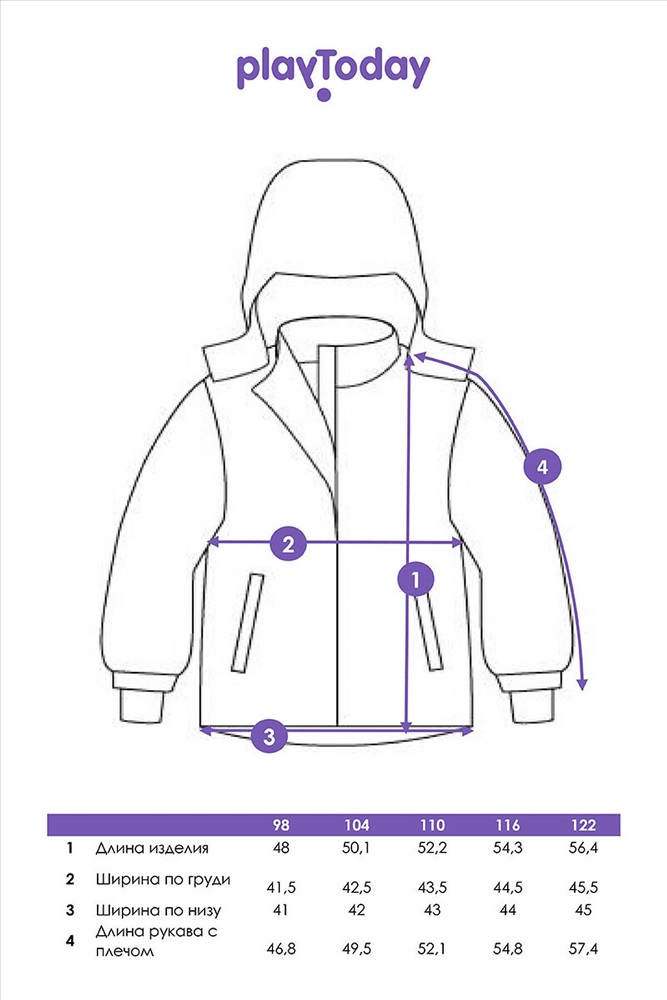 Производитель: PLAYTODAY ID товара: 1035207 Состав: Верх- 100% Полиэстер; Мембранное покрытие 5000*5000; Подкладка- флис 100% Полиэстер; Утеплитель- куртка 250 г/м2 Сезон: Осень/Зима Длина: Средняя Фасон: Прямой Рукав: длинные Вид застежки: Молния Рисунок: Фантазийный Тип карманов: Прорезные Декоративные элементы: С капюшоном Утеплитель: с утеплителем, 250 г/м2 Стиль: повседневный Реком. темп. режим: до -25ºС Страна бренда: Германия Страна производства: Китай