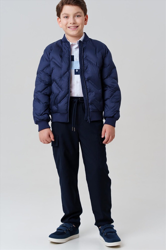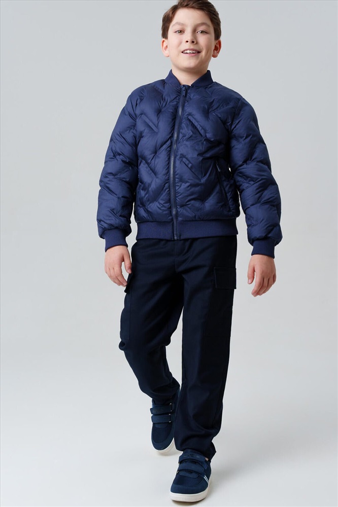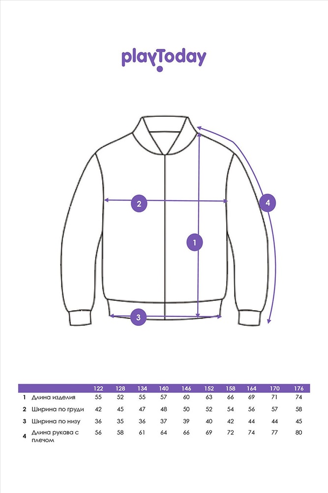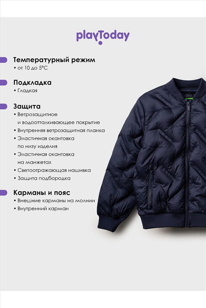 ID товара: 1178845 Состав: Корпус- 100% Полиэстер; Подкладка- таффета; Наполнитель- 150 г/м2 Сезон: Демисезон Длина: Средняя Фасон: Свободный Рукав: Длинные Вид застежки: Молния Тип карманов: Прорезные Утеплитель: с утеплителем, 150 г/м2 Стиль: Повседневный Реком. темп. режим: до -5ºС Страна бренда: Германия Классическая темно-синяя демисезонная куртка бомбер для мальчика подростка от PlayToday — отличный выбор для прохладной осени и начала весны. Универсальная модель для школы, прогулок и городских будней: сочетает аккуратный внешний вид, тепло и защиту от непогоды. Преимущества модели: + верх из непромокаемого и непродуваемого материала + гладкая подкладка + практичные карманы + эластичный риб по низу и рукавам + лаконичный крой без капюшона + оптимален для температур до - 5 °C + универсальный темно-синий цвет + легкий уход Эта подростковая демисезонная куртка для школы создана с учётом активного образа жизни подростков. Непромокаемый и непродуваемый верхний слой защищает от внезапного дождя и прохладного ветра. Внутренняя гладкая подкладка обеспечивает комфорт в носке и лёгкость при надевании. Риб-манжеты по низу изделия и на рукавах плотно прилегают к телу, не пропускают холод и помогают сохранять тепло. Отсутствие капюшона делает силуэт аккуратным, а образ — собранным и современным. Такая универсальная детская куртка для мальчиков подходит как к школьной форме, так и к повседневной одежде. Совет по стилю: сочетайте эту стильную школьную куртку для подростков с джинсами, школьными брюками, свитшотами и лонгсливами от PlayToday. Нарядный классический темно-синий бомбер станет основой стильного образа для школы, прогулок и поездок на выходных. Модель не требует сложного ухода: стирается при температуре до 30 °C, быстро сохнет и сохраняет форму. Представлена в размерах на рост от 122 до 170 см — подойдёт для мальчиков от 7 до 16 лет. Модная демисезонная куртка бомбер в школу для мальчика от PlayToday — тепло, функциональность и стиль в одной модели. Идеальный вариант для межсезонья! Комментарии к товару