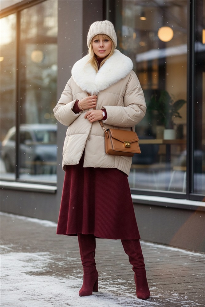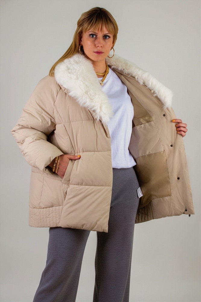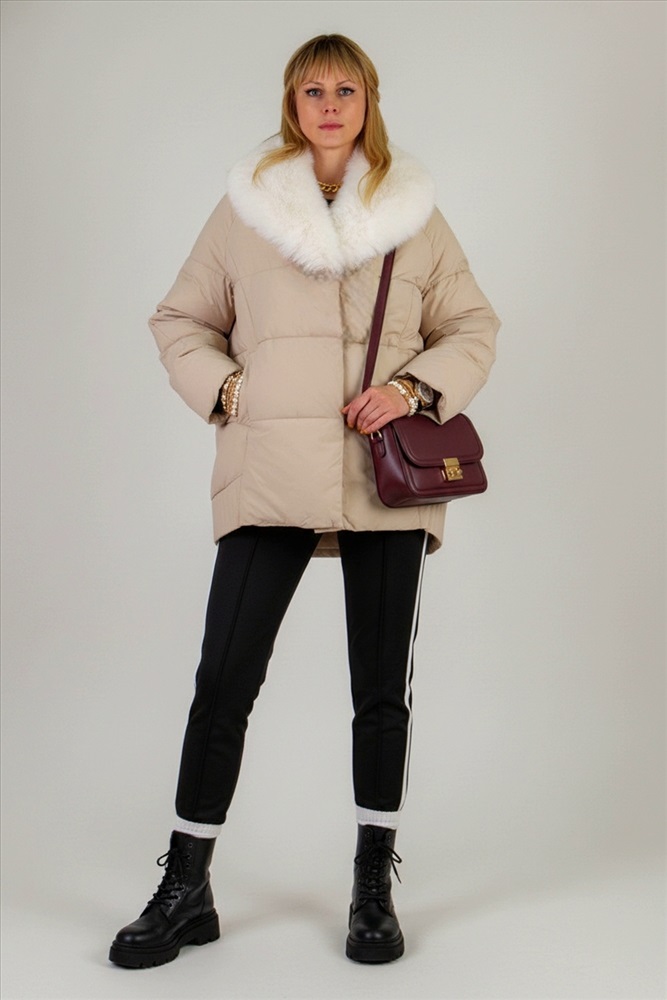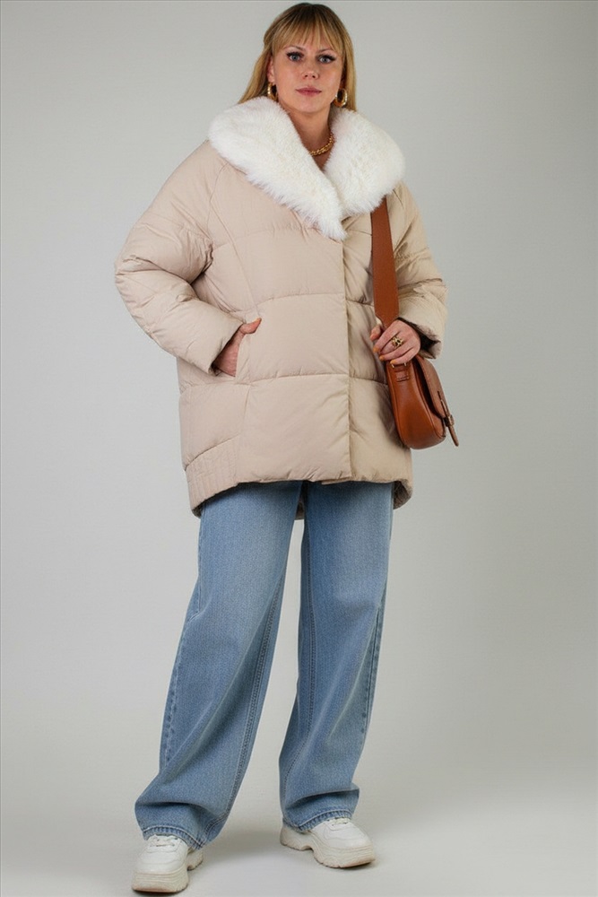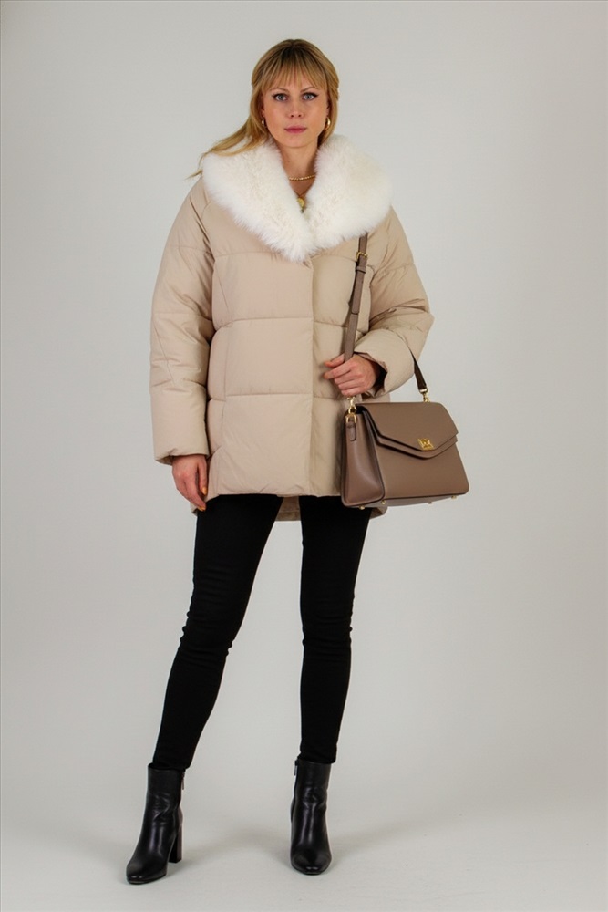 Ключевая деталь съёмный воротник из качественного искусственного меха белого контрастного цвета. Он придаёт образу нотку элегантности и роскоши. Воротник легко снимается, позволяя видоизменять образ под настроение. Застёжка-молния дополняется скрытой утеплённой планкой на кнопках, что препятствует проникновению холода внутрь. Внутренняя отделка оснащена файбер-наполнителем: продуманная простёжка исключает сминание и скопление утеплителя в отдельных зонах, обеспечивая равномерное тепло по всему объёму куртки.