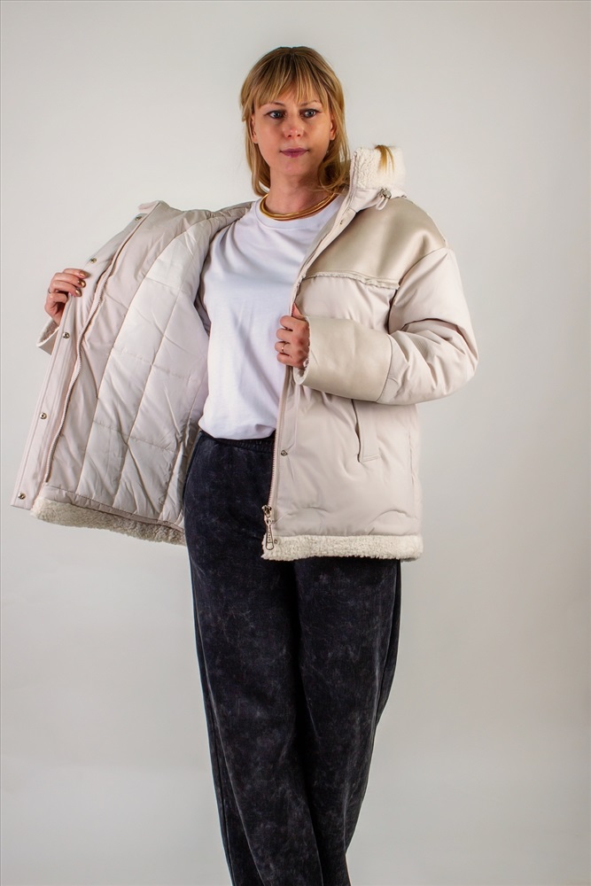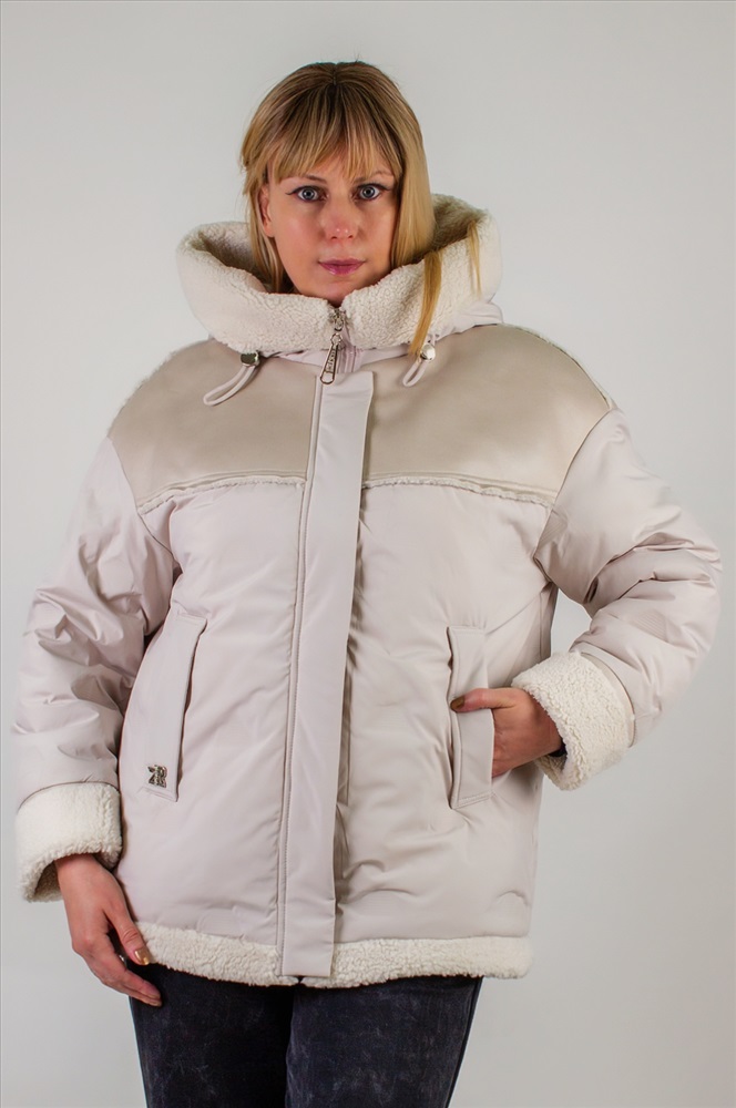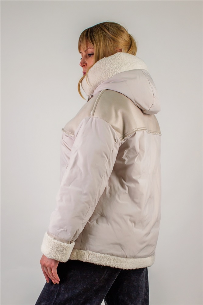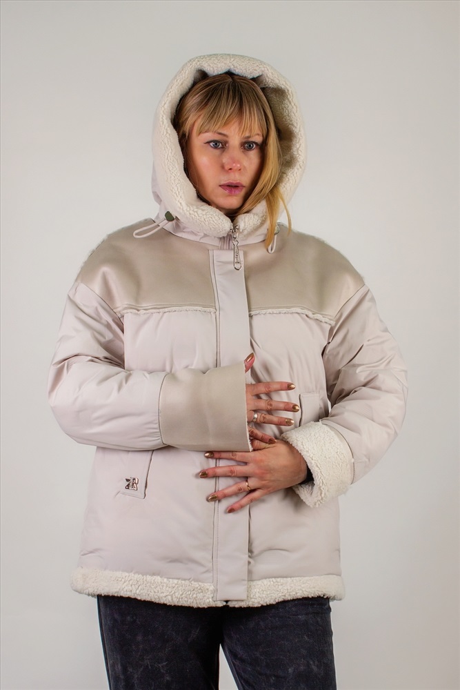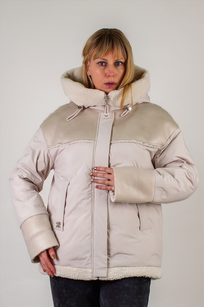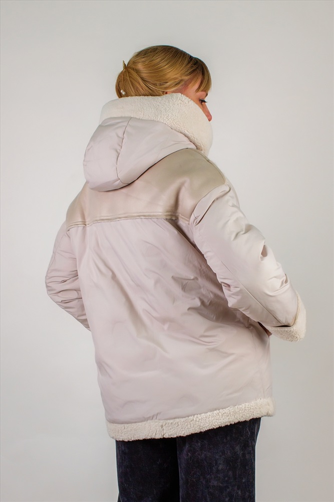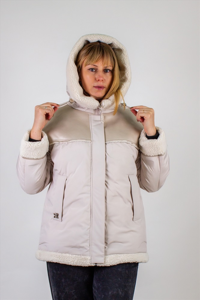 Капюшон со стойкой-воротником на металлических фиксаторах, отделан двусторонней меховой опушкой в цвет изделия. Меховая отделка повторяется по низу куртки, придавая модели законченный образ.