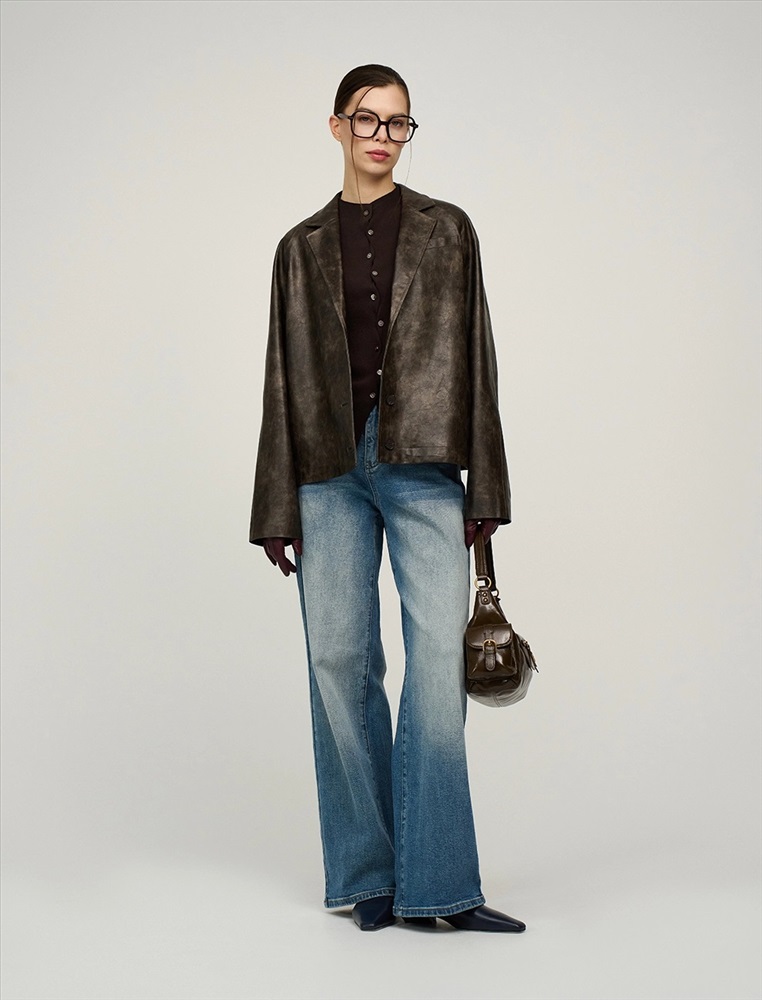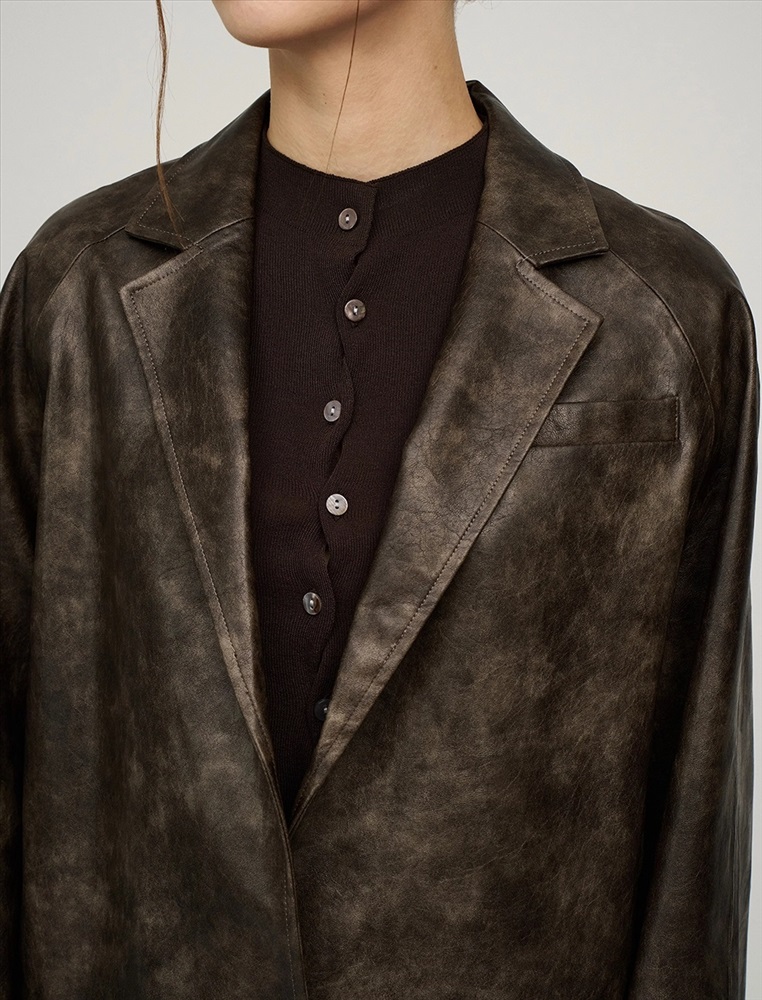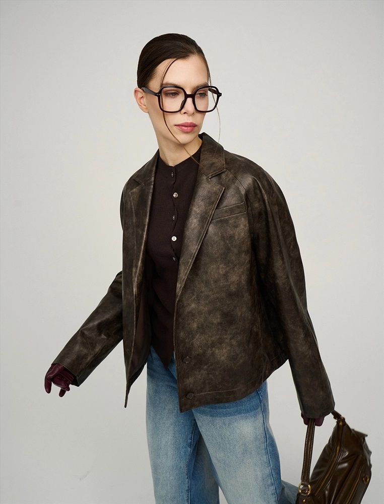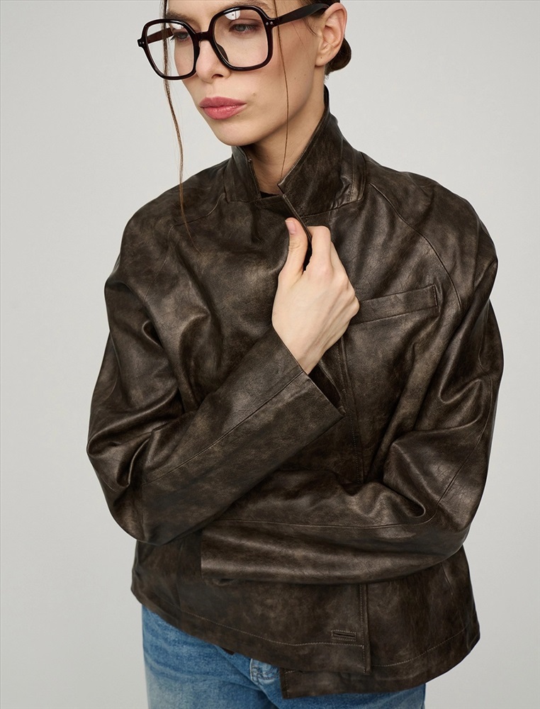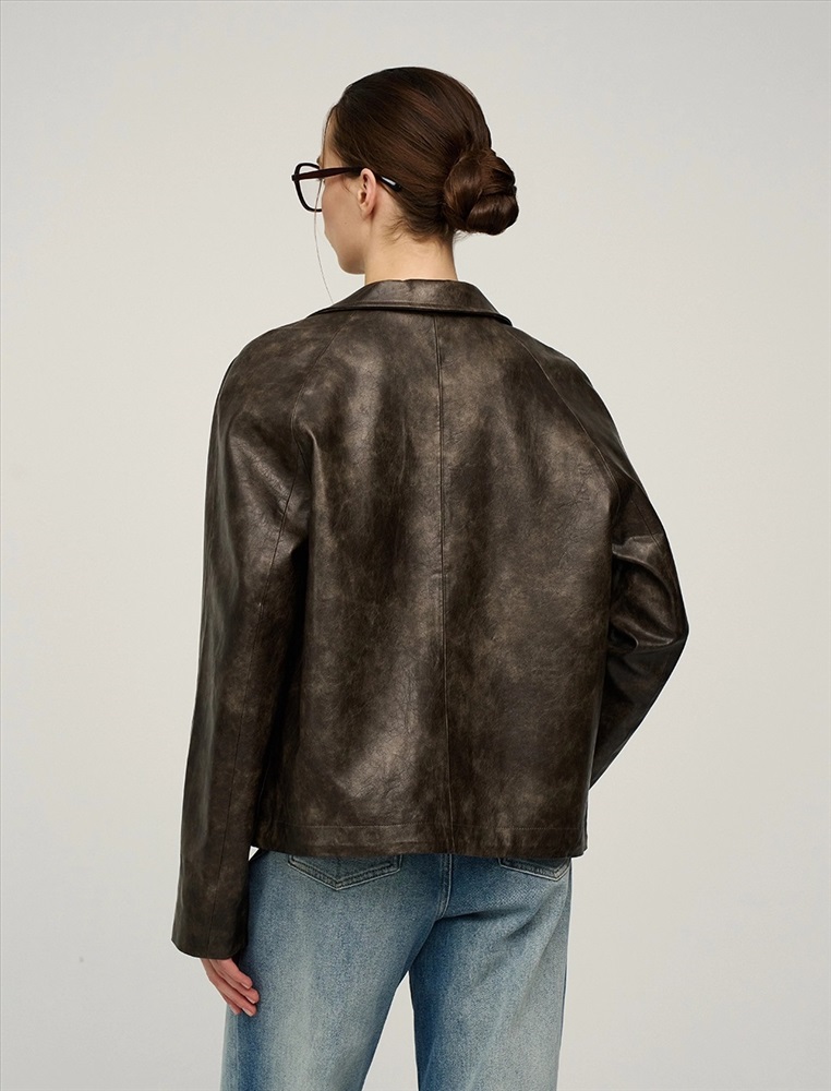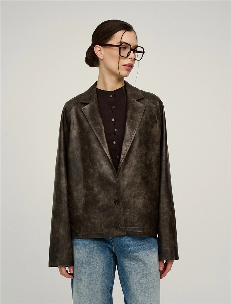 Укороченная куртка из эко-кожи. Куртка-жакет с отложным воротником и лацканами по переду изделия и застежкой на две пуговицы. Два кармана в рельефных швах по переду куртки. Рукава длинные – реглан с двумя швами. Низ изделия дополнен внутренней кулиской на резинке и стопперах для формирования силуэта-баллон по низу куртки. Выполнена из вареной эко-кожи с мраморным эффектом на подкладке в тон изделия.